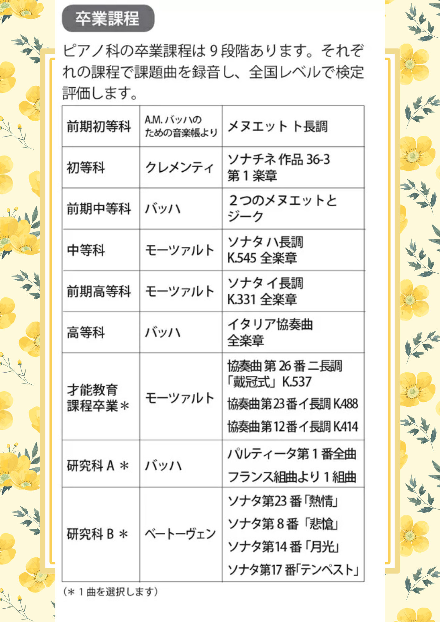 前期初等科から研究科まで数段階の検定曲を演奏し、録音をして提出する制度です。卒業制度は、生徒さんに明確な目標を与え、その目標に向かって一生懸命に学び、 一つの目標を超えた喜びと自信を持ってもらうために設けられています。